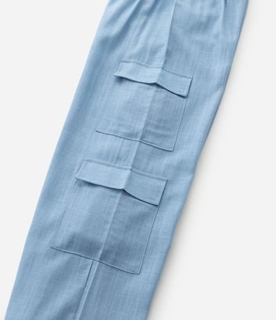 Calça infantil confeccionada em viscolinho mais sustentável, no modelo reto. Possui cós elástico, com lacinho lateral, bolso cargo e sem estampa.