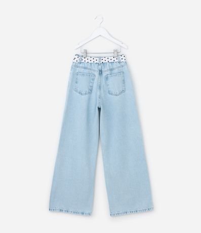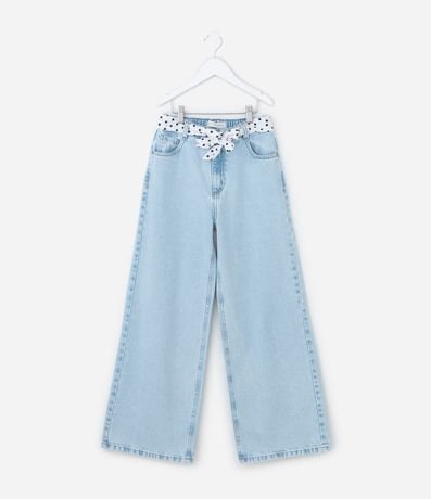 Ref: Calça infantil confeccionada em jeans de algodão certificado BCI, com modelagem wide leg que oferece caimento amplo e confortável. Possui cós com passantes e acompanha cinto removível estampado em poá, além de bolsos funcionais, costuras aparentes e fechamento frontal por botão e zíper.