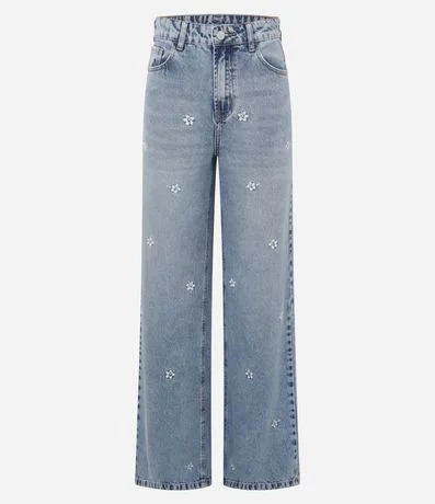 Calça Jeans Reta em Denim com Estampa Flor Hibiscos