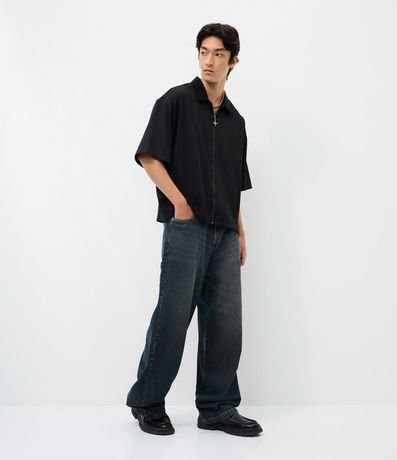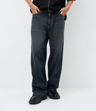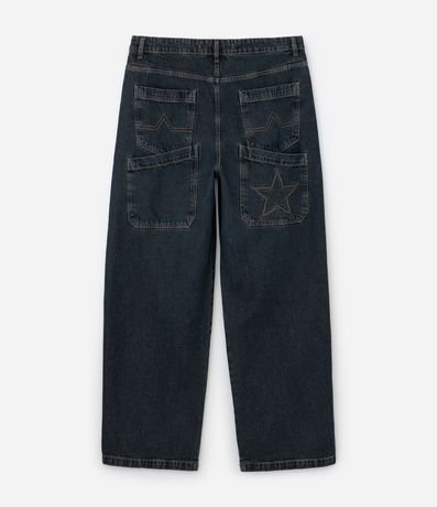 Calça jeans masculina confeccionada em denim de algodão mais sustentável, com acabamento liso, modelagem super baggy e detalhe de estrela no bolso traseiro, ideal para um visual fashion com identidade urbana.