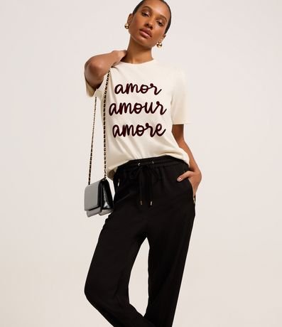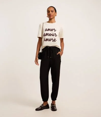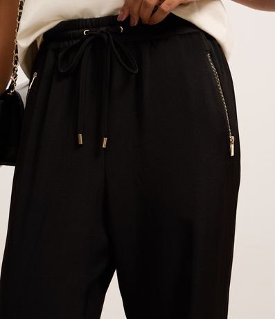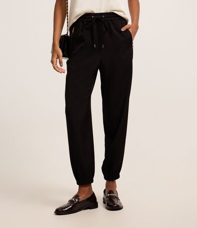 Ref: Calça jogger de estrutura alfaiatada de cintura alta, com elástico e amarração com detalhes metalizados no cós. A peça tem bolsos frontais com zíperes. Peça com forro quentinho.