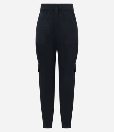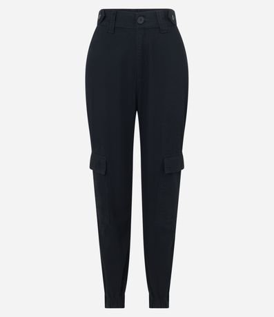 Calça jogger cintura alta em sarja com detalhe passante de fivela no cós e bolsos cargo. Confeccionado em material responsável.