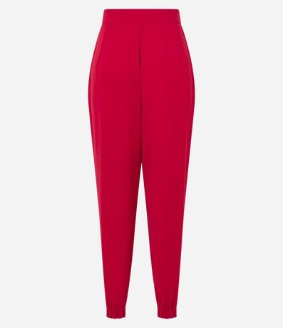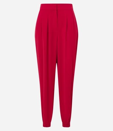 Calça feminina de modelo jogger, confeccionada em crepe, com pregas e fechamento frontal com zíper.