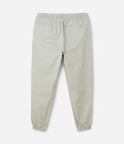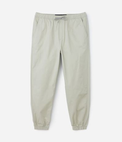 Calça confeccionada em sarja mais sustentável com boas práticas ambientais no modelo jogger, em sarja estonada, com cós elástico e cordão para ajuste, bolsos laterais e barra elástica.