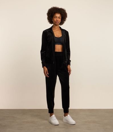 Calça esportiva confeccionada em microfibra com cós de elástico.