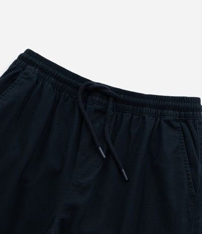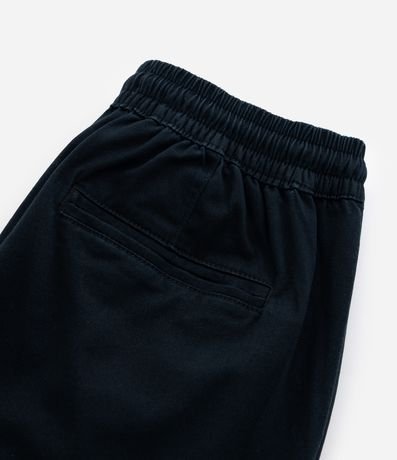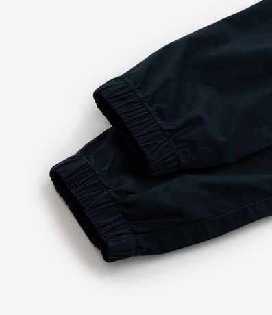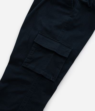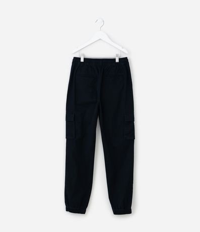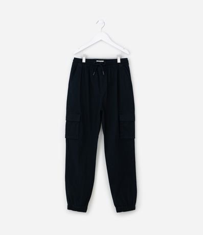 Calça jogger infantil em sarja, com cintura elástica, cordinha para amarração, barra elástica e bolsos cargo utilitário.