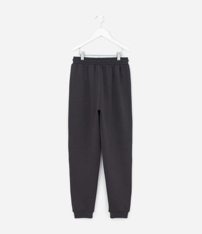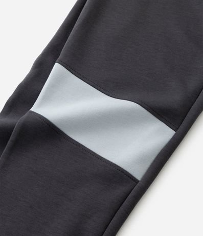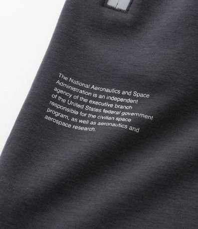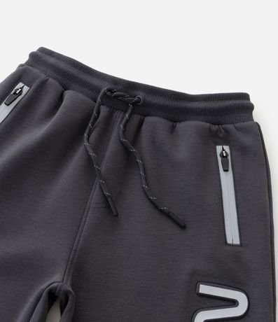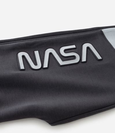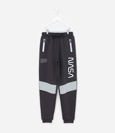 Ref: Calça jogger infantil, com amarração no cós, bolsos com fechamento por zíper, recortes contrastantes nos joelhos e diferencial de estampa refletiva da NASA.