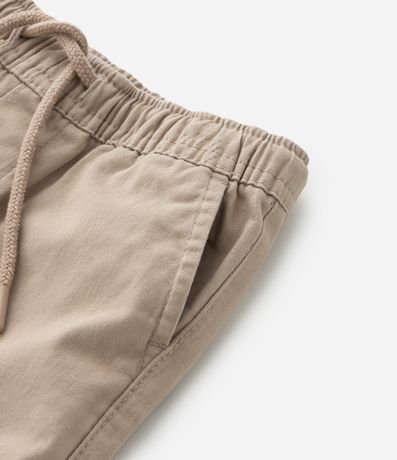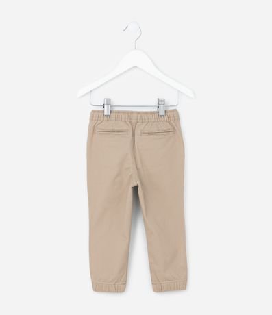 Calça infantil confeccionada em sarja de algodão mais sustentável, de modelo jogger, com amarração no cós, bolsos e barra elástica.