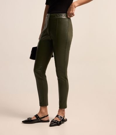 Ref: Calça legging em material sintético na parte frontal e ponto roma na traseira. A peça possui detalhe em corrente no cós.
