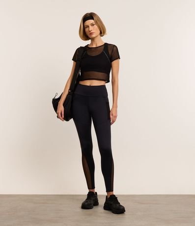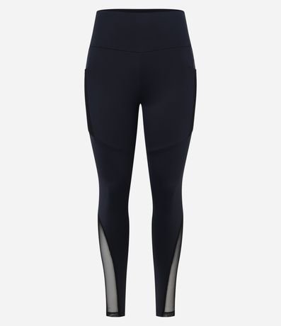 Calça Legging Esportiva em Microfibra com Recortes de Tule e Bolsos