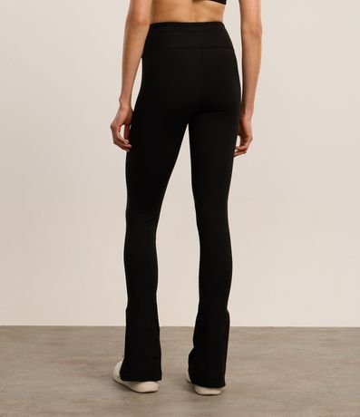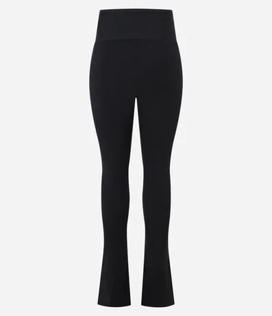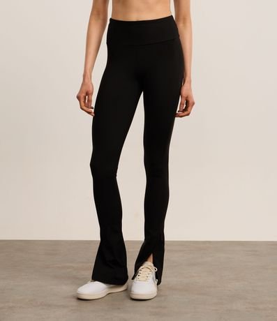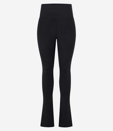 Ref: Calça esportiva confeccionada em microfibra leve. A peça sem estampa vem ajustada desde a cintura até a panturrilha, onde se abre levemente com uma fenda.