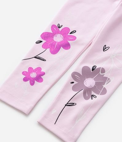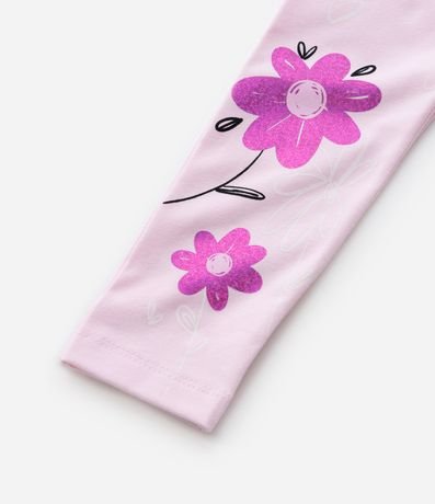 Calça infantil de modelo legging, confeccionada em cotton, com cós elástico e estampa de florzinhas em foil brilhante.