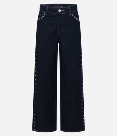 Ref: Calça loose de cintura baixa, confeccionada em jeans, com passantes no cós, fechamento tradicional, bolsos e tachas aplicadas desde os bolsos frontais até as laterais. Este produto possui algodão certificado BCI em sua composição, sendo ambientalmente mais responsável.