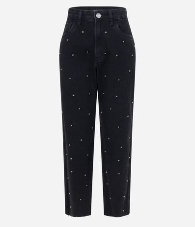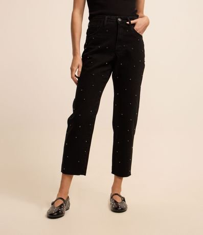 Ref: Calça mom, comfort com passantes no cós, bolsos frente e costas, brilhos aplicados e confeccionada em jeans.
