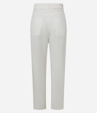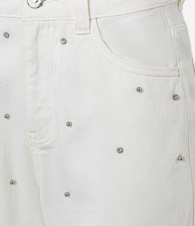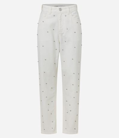 Ref: Calça mom comfort de cintura alta, confeccionada em sarja, com passantes no cós, fechamento tradicional, bolsos e brilho aplicado com bolinhas metalizadas e pedrarias de strass. Este produto possui algodão certificado em sua composição, sendo ambientalmente mais responsável.