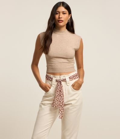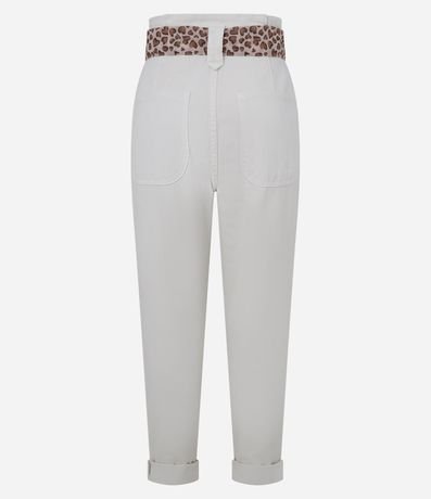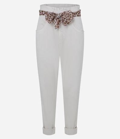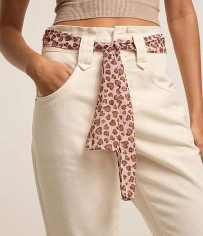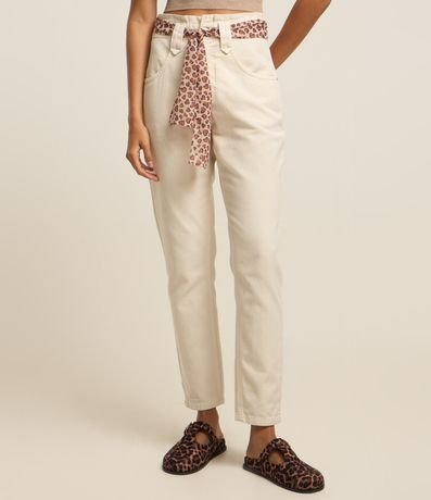 Ref: Calça feminina confeccionada em jeans mais sustentável, no modelo mom, cós com passantes e lenço com estampa de animal print, fechamento tradicional, bolsos.