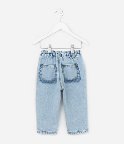 Calça infantil confeccionada em jeans mais sustentável com boas práticas ambientais, no modelo mom. Possui cós elástico, com passante, fechamento tradicional e bolsos com detalhes.