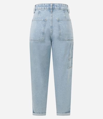 Ref: Calça mom feminina, confeccionada em jeans, com fechamento no cós frontal, com passantes, bolsos carpinteiro e detalhes levemente estonados.