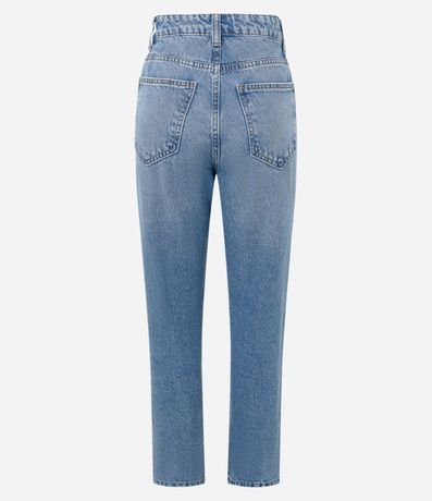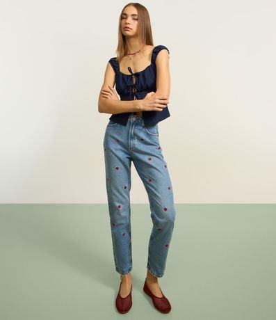 Ref: Calça mom confeccionada em jeans com algodão bci mais sustentável, bolsos frente e costas e possui bordadinhos em repetição de morangos na parte frontal.