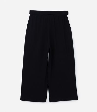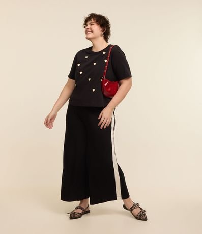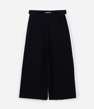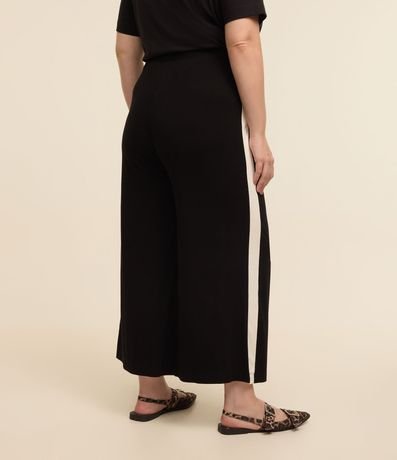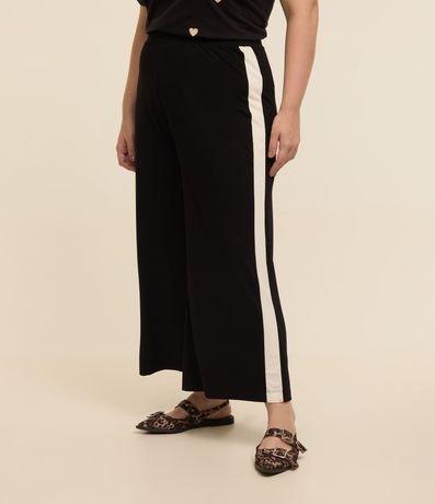 Calça feminina de modelo pantacourt, plus size, confeccionada em viscose com elastano, sem estampa e com detalhe de listra lateral contrastante.