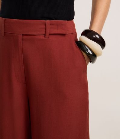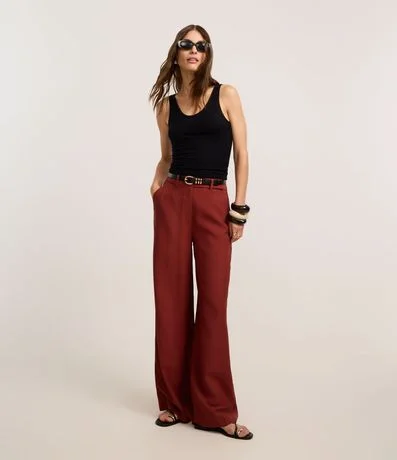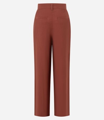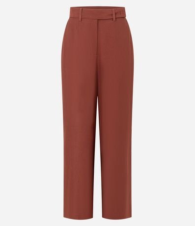 Calça feminina confeccionada em viscose e poliéster, de modelo pantalona, com cintura alta e sem estampa. Possui corte alfaiatado, cinto embutido e fechamento frontal.