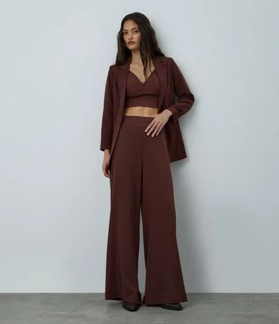 Calça feminina alfaiatada no modelo pantalona com cós liso e pregas.