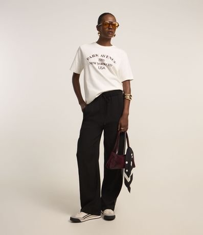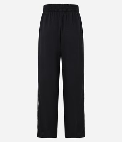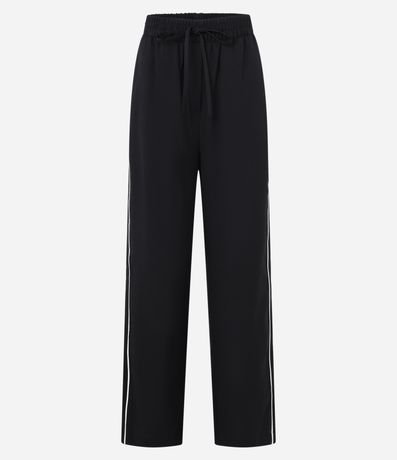 Ref: Calça pantalona em crepe, com cintura alta elástica com cordão, viés contrastantes na lateral.