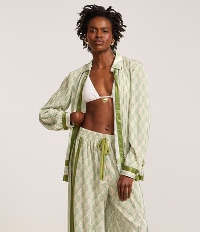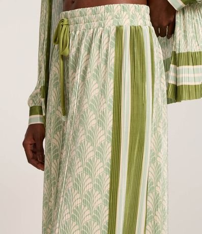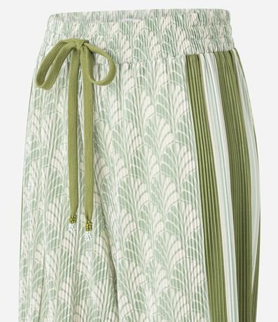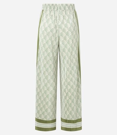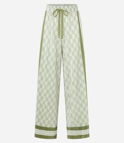 Calça pantalona cm cintura alta, cós elástico com cordão contratante para amarração, estampa de folhagens e listras nas laterais.