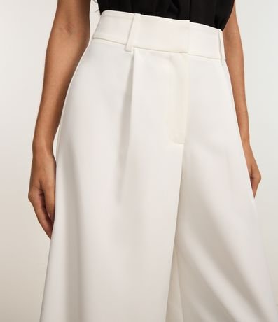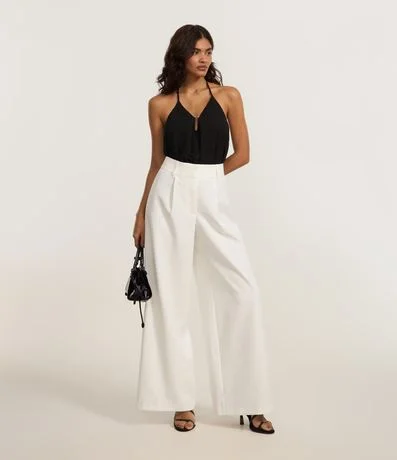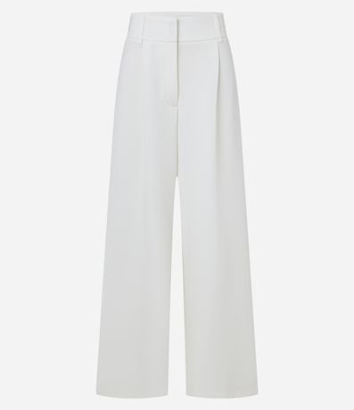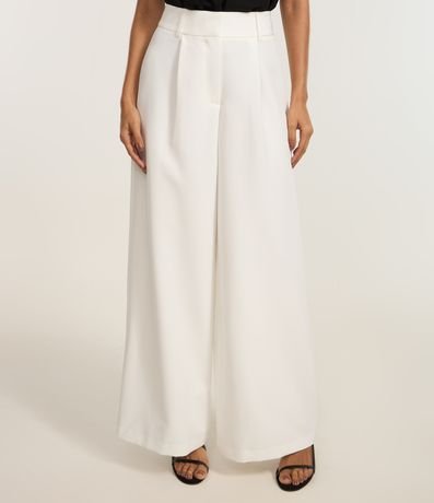 Calça pantalona com corte alfaiatado, confeccionada com elastano, cós largo com passantes e pregas frontais.
