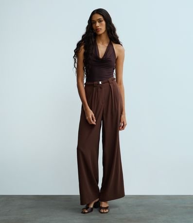 Ref: Calça feminina em crepe com modelagem wide leg e caimento elegante. Possui cós alto com detalhe franzido sutil e acompanha um cinto elástico. A frente conta com pregas duplas, que adicionam volume e sofisticação à peça.