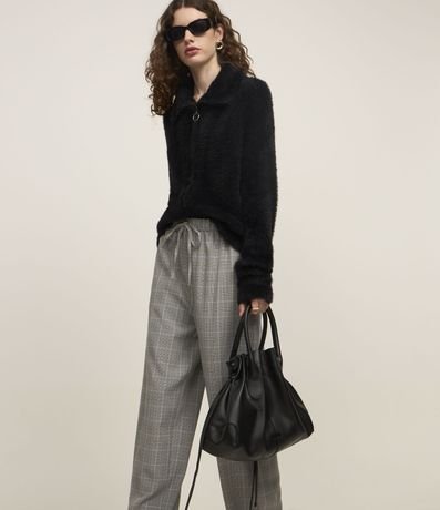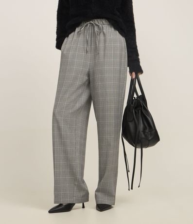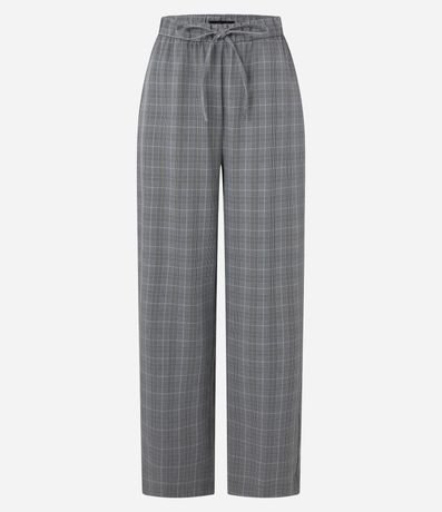 Calça pantalona confeccionada em crepe com estampa xadrez e cós de elástico.