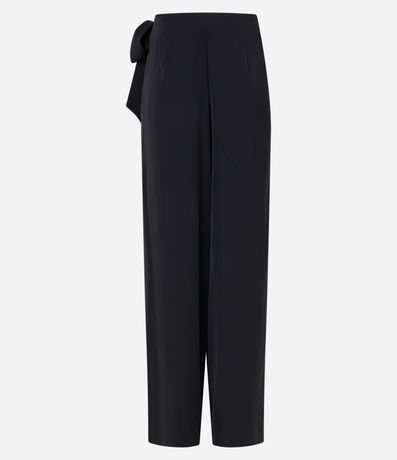 Calça pantalona, em crepe, com sobreposição e amarração faixa na lateral e sem estampa.