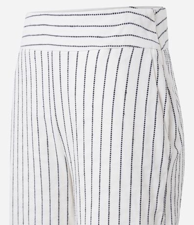 Calça pantalona feminina, confeccionada em tricoline, com zíper lateral no cós, bolsos faca e estampa listrada pontilhada.