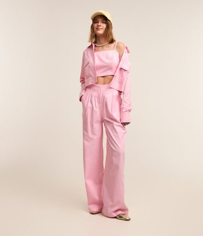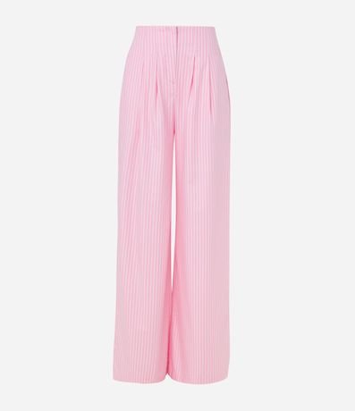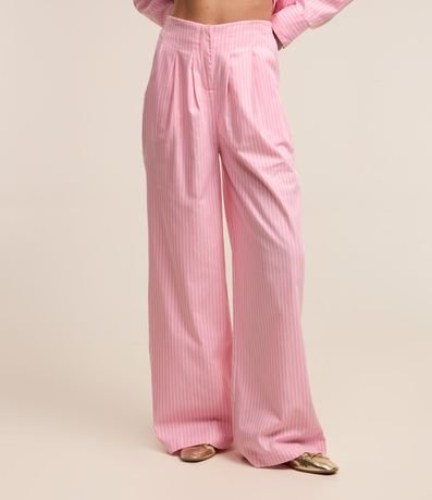 Calça pantalona, confeccionada em tricoline, bolsos, pregas frontais e listras em fio tinto.