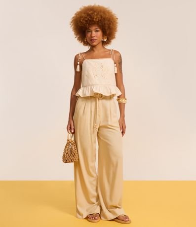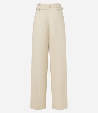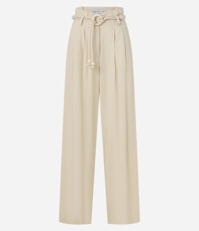 Ref: Calça feminina confeccionada em viscolinho com viscose certificada, peça no modelo pantalona com cós passantes, fechamento tradicional, cinto de corda encapado com fivela contrastante de aviamento, esferas nas pontas e pregas.