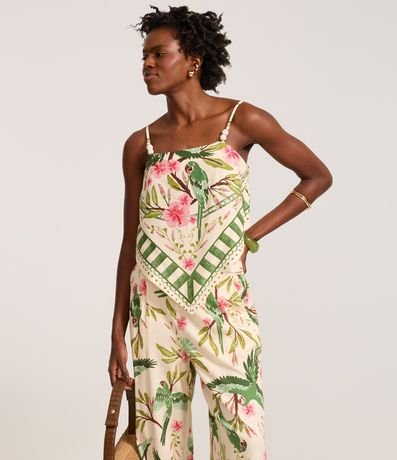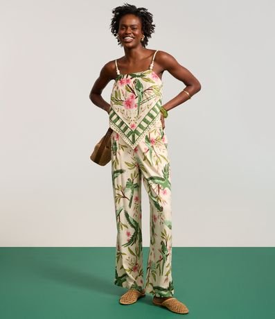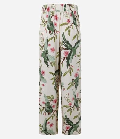 Ref: Calça pantalona com cintura alta, cós largo com botões forrados nas laterais e estampa tropical com pássaros e flores.