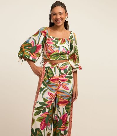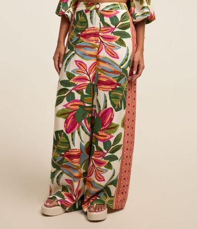 Ref: Calça pantalona, confeccionada em viscose, com estampa tropical com lateral estilo étnica.