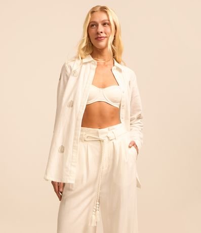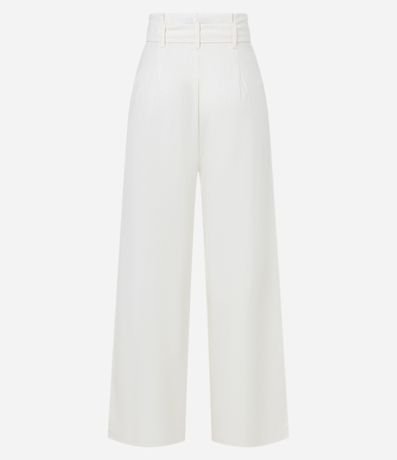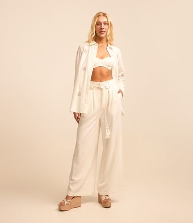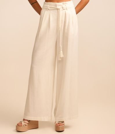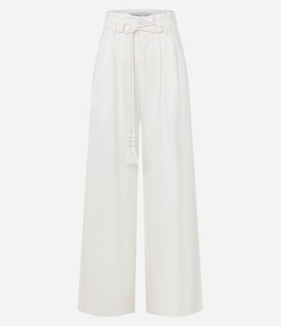 Calça pantalona confeccionada em viscose e linho, cinto de corda trançadinha e tassel na ponta. Pregas frontais e sem estampa.