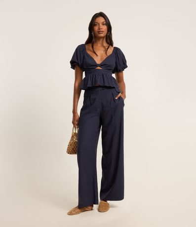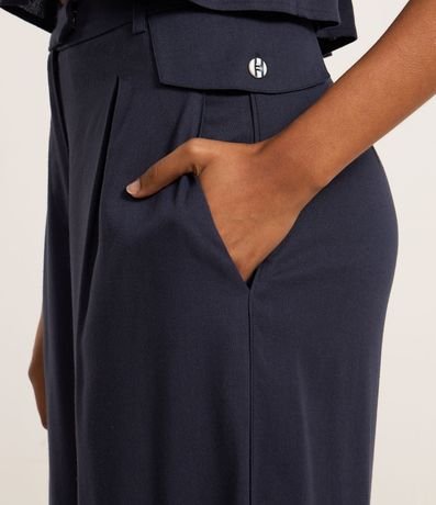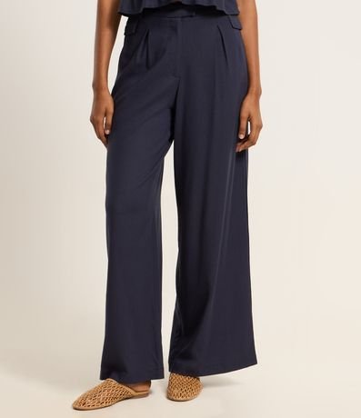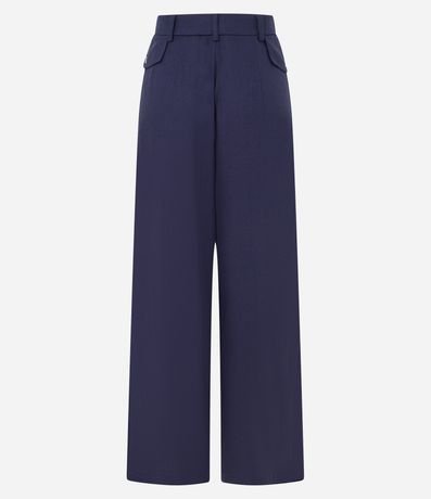 Ref: Calça pantalona com fechamento deslocado no cós, detalhe em lapelas nas laterais e piping frontal.