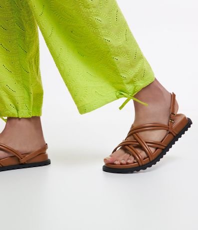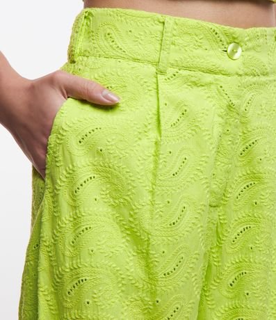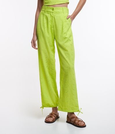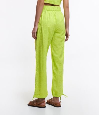 Ref: Calça parachute, confeccionado em laise, bolsos laterais, cós com passantes, bordado floral paisley e com amarração na lateral da barra.