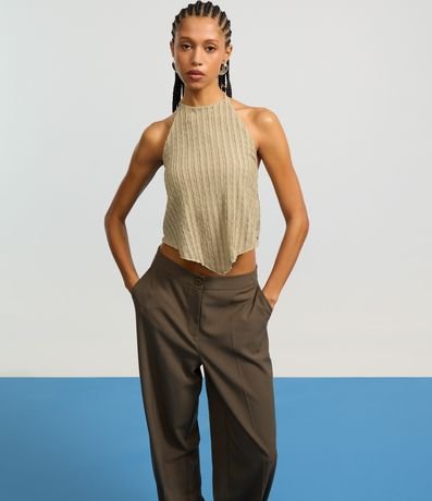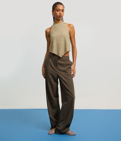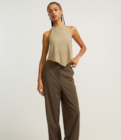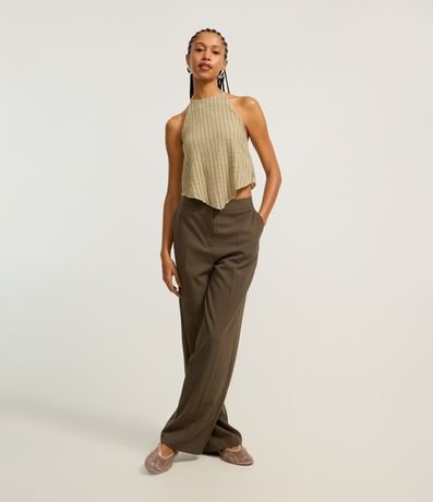 Calça reta feminina, de corte alfaiatado, com fechamento frontal tradicional, bolsos e frisos.