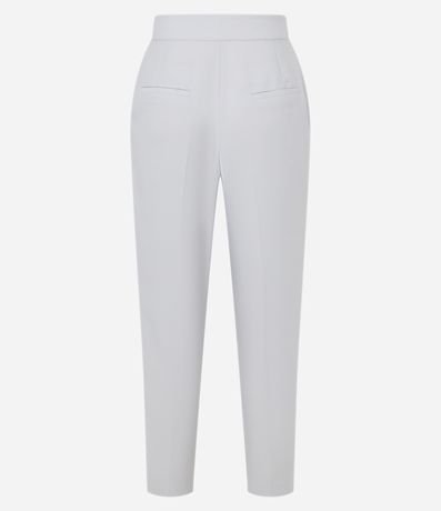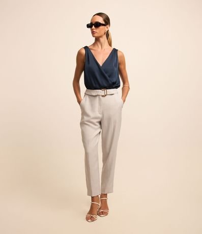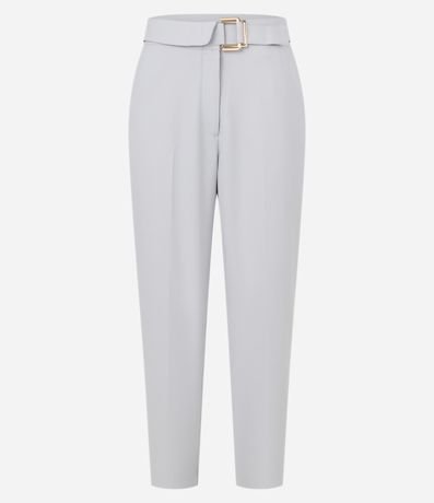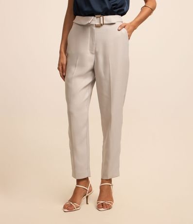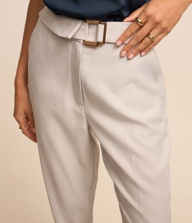 Ref: Calça reta de cintura alta com corte alfaiatado além de cinto com fivelas metalizadas e sobreposição de lapela.