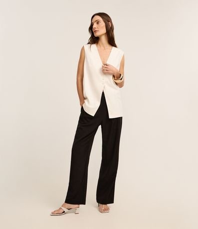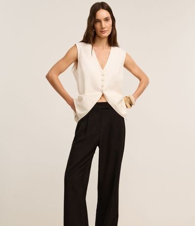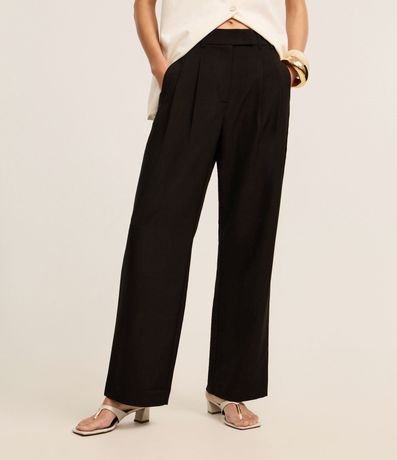 Ref: Calça feminina de modelo reto, confeccionada em crepe, com corte alfaiatado e sem estampa. Possui detalhe de cós transpassado e pregas frontais.