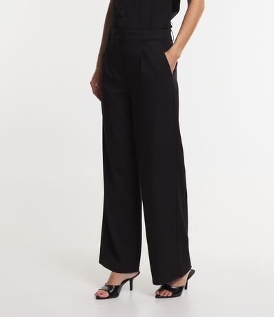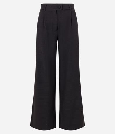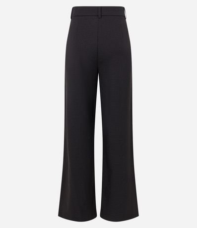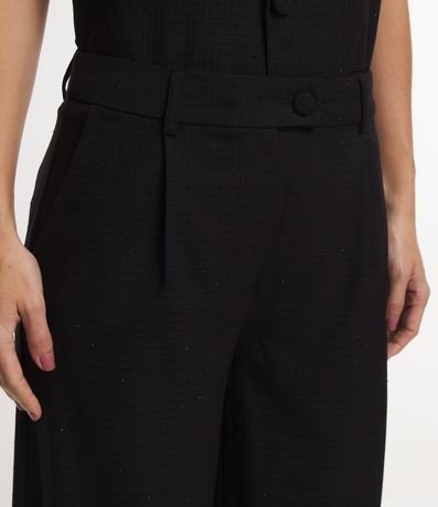 Calça reta alfaiatada feminina, com passantes no cós, abotoamento frontal e bolsos. A peça também conta com estampa xadrez e detalhes de brilho.