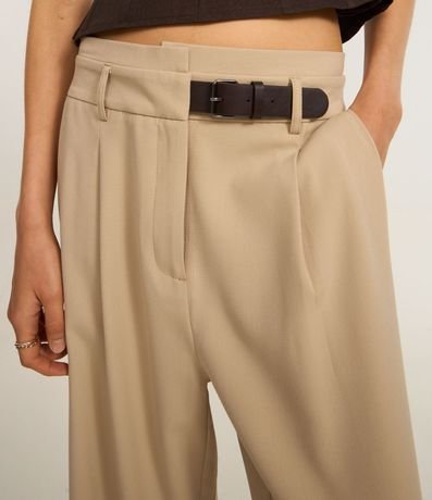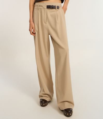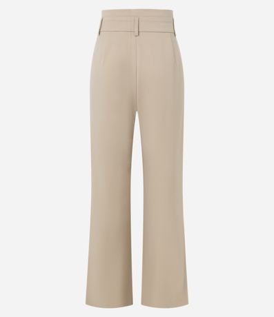 Calça alfaiatada feminina, de modelo reta, com passantes no cós e sem estampa. Possui detalhe de pregas e diferencial de meio cinto embutido na parte frontal.