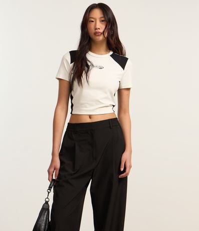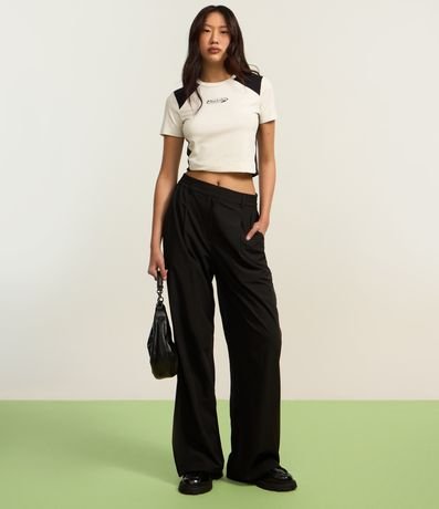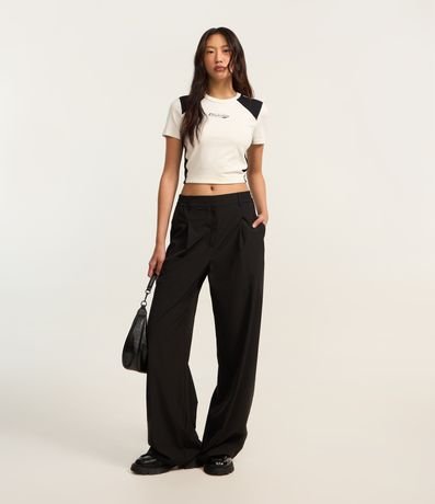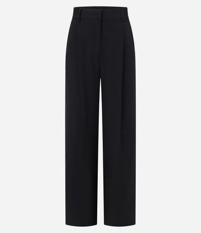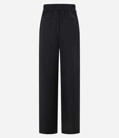 Ref: Calça reta de corte alfaiatado com passantes na cintura e elástico detrás do cós. A peça tem bolsos falsos atrás.