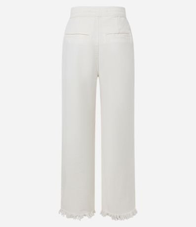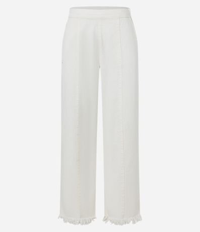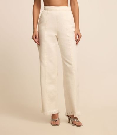Ref: Calça reta de corte alfaiatado confeccionada em jeans com fechamento tradicional por botão e zíper, além de recortes frisados verticais e barras desfeitas com franjinhas. Possui bolsos.