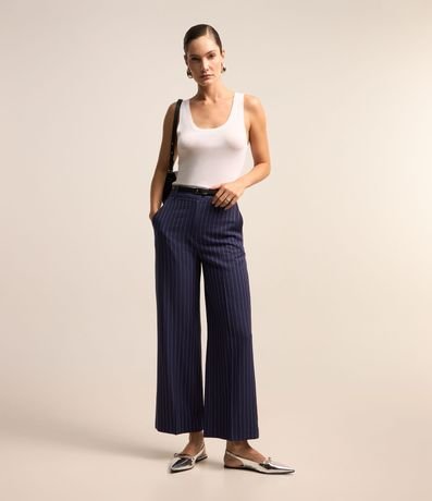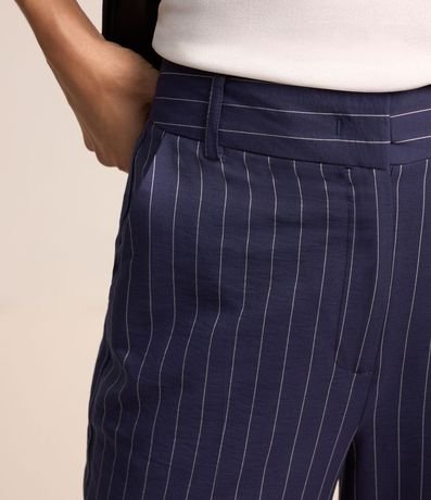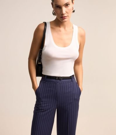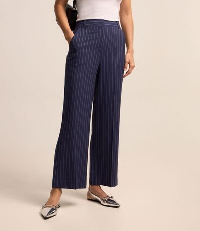 Ref: Calça reta com corte alfaiatado confeccionado em viscose com fechamento tradicional além de listras riscas de giz.