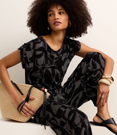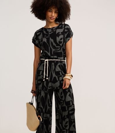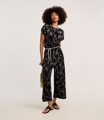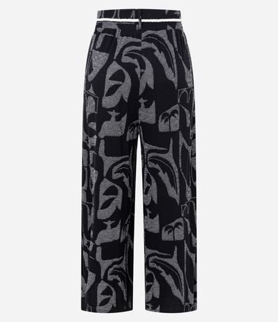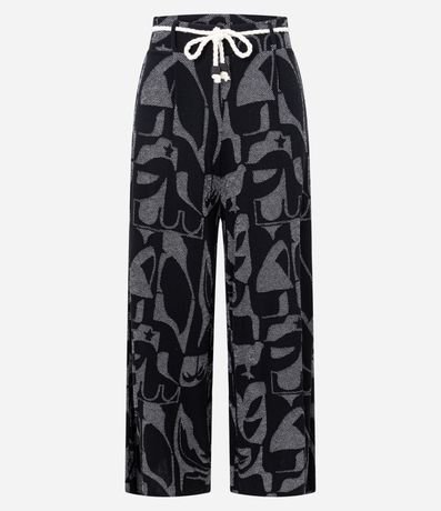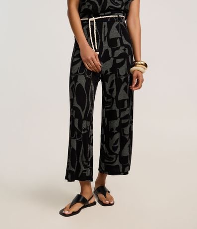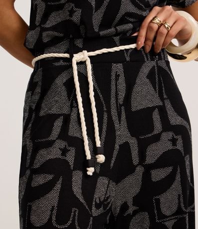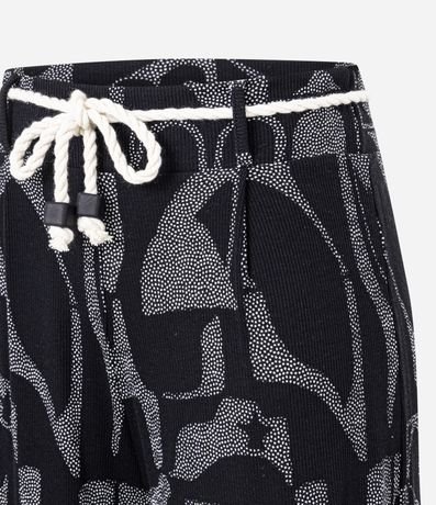 Calça Reta Canelada em Viscose com Cinto Corda e Estampa Abstrata