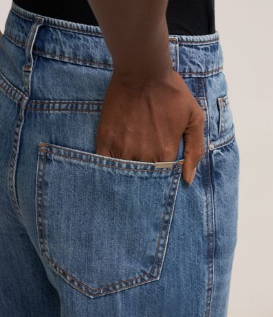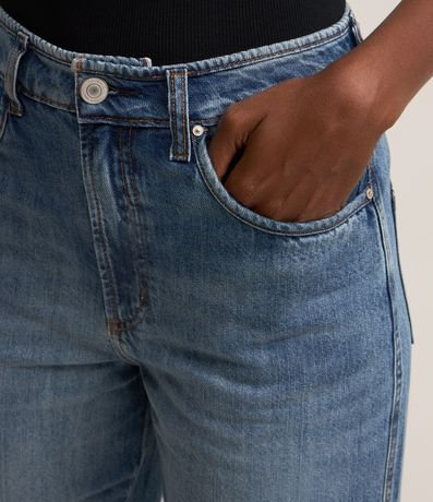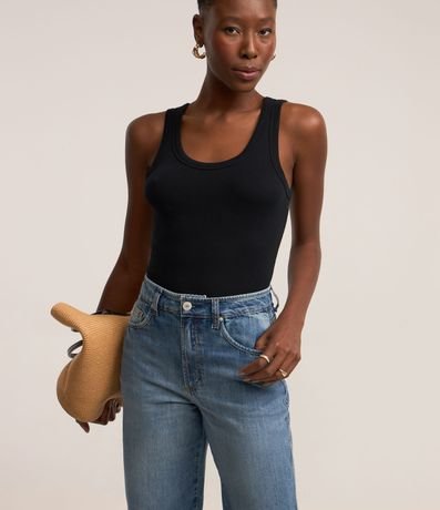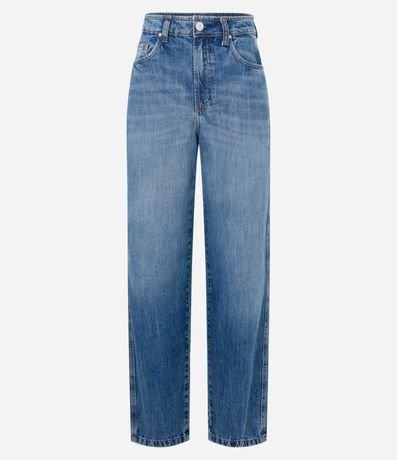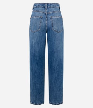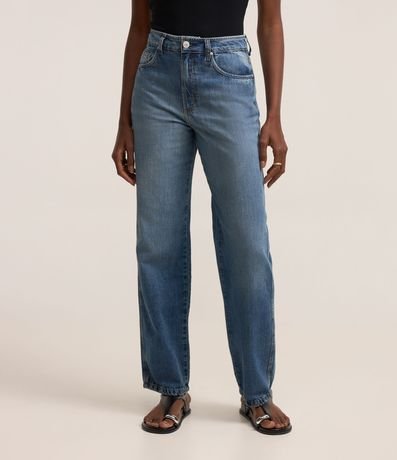 Ref: Calça reta confeccionada em jeans com cintura alta, passantes na cintura, fechamento tradicional por botão e zíper e bolsos frontais e traseiros.